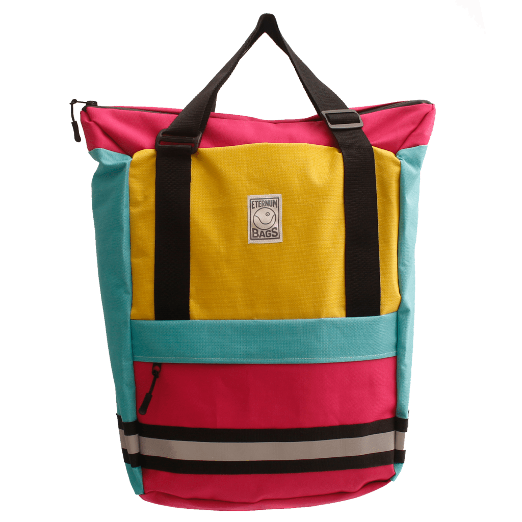 A vibrant Atlas model combining pink, turquoise, and yellow panels. It features a spacious main compartment and a quick-access front pocket—durable, lightweight, and designed to stand out in your everyday city rides.