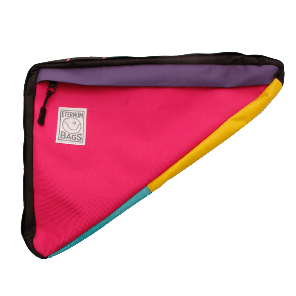 A bold triangular frame bag combining pink, turquoise, yellow and a purple accent. Lightweight, durable, and designed to fit inside your bike’s main triangle—ideal for carrying tools or essentials while keeping a clean, streamlined setup.