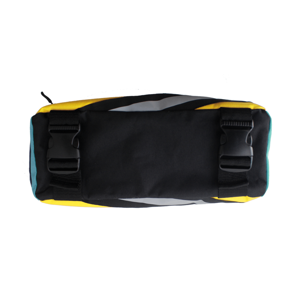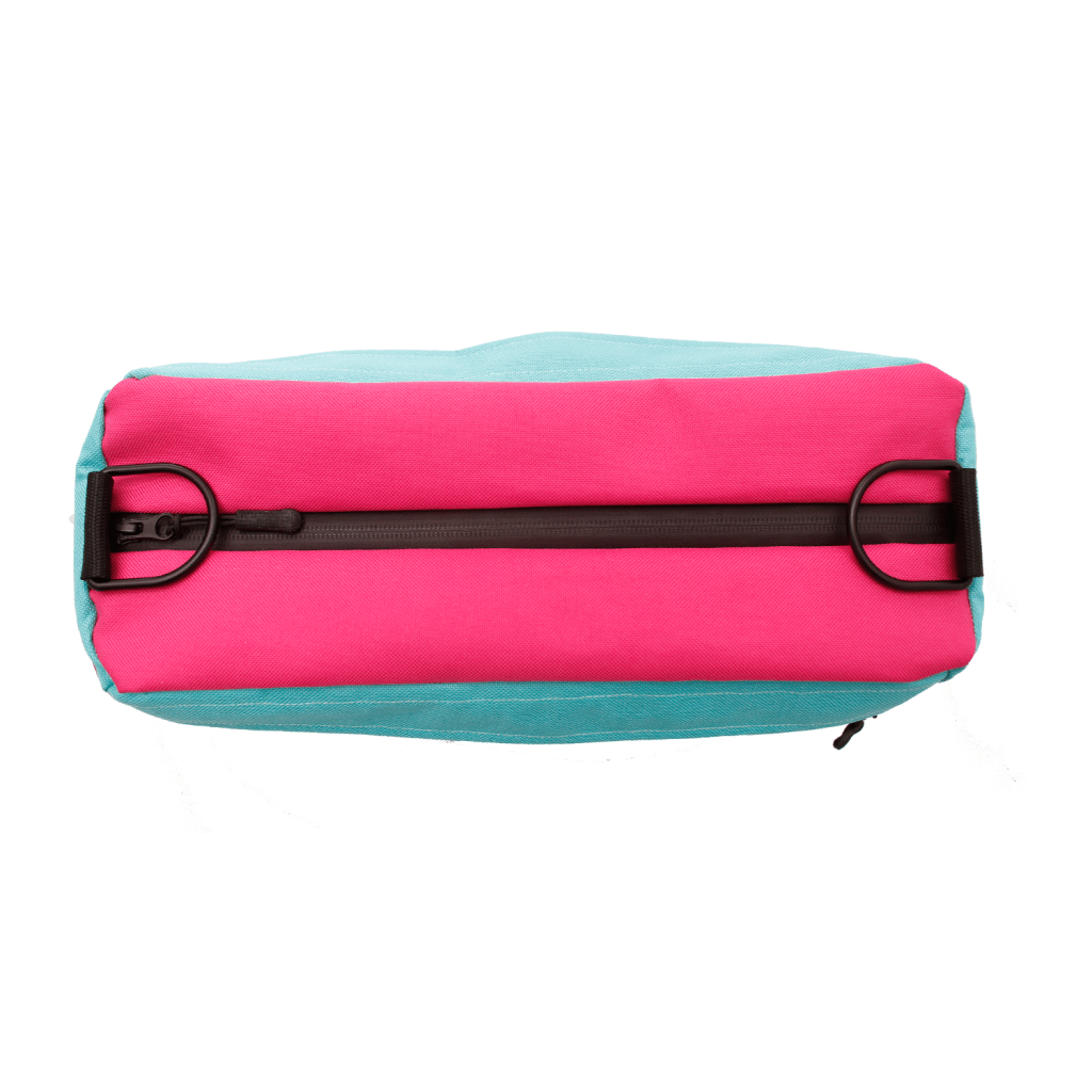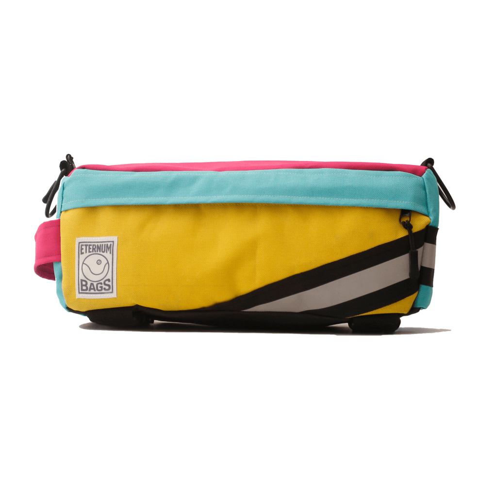 Handmade with a bold combination of pink, turquoise, and yellow panels, this Core model stands out instantly—adding color, visibility, and personality to your bike. Though compact, it offers a roomy main compartment and two additional side pockets, making it easy to organize and access your items on the go. Built for cyclists who appreciate simplicity, durability, and vibrant design.